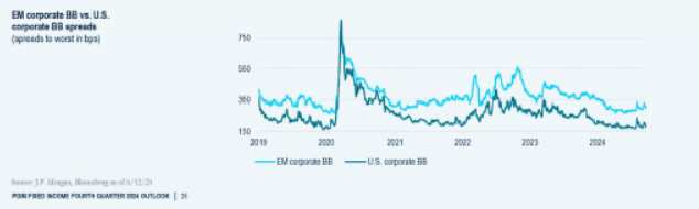Continuiamo a vedere il valore migliore nelle obbligazioni societarie dei mercati emergenti e in alcuni emittenti BBB a più lunga scadenza. Continuiamo inoltre a privilegiare l’esposizione alla duration dei mercati emergenti, anche se non tanto quanto prima dei recenti rally. È probabile che i fattori top-down rimangano fattori chiave nel breve termine, guidando potenzialmente le opportunità tattiche fino a quando il panorama non potrà essere rivalutato dopo l’esito delle elezioni statunitensi.