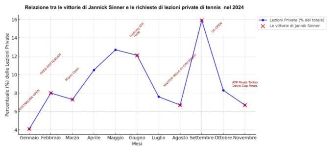 Nel 2024, la richiesta di lezioni private di tennis ha registrato un aumento straordinario, con una crescita del 149% rispetto al 2023 (fonte Letuelezioni). Questo incremento potrebbe essere stato influenzato dai 9 importanti tornei vinti da Jannik Sinner durante l’anno, che hanno contribuito a portare maggiore visibilità al tennis e a ispirare un pubblico sempre più ampio ad avvicinarsi a questo sport. In particolare, mesi come maggio e settembre, in cui si sono registrati picchi significativi di iscrizioni, potrebbero riflettere l’effetto positivo del crescente interesse verso questa disciplina.