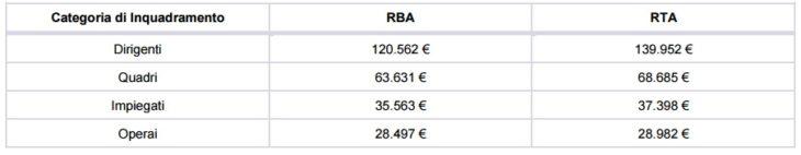 Nella tabella seguente il dettaglio delle retribuzioni base e totale annue medie per inquadramento (la RTA è