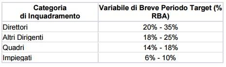 La tabella a fianco mostra invece le percentuali di variabile di breve periodo a target, ovvero legate al raggiungimento degli obiettivi all’interno di un sistema di incentivazione formalizzato.