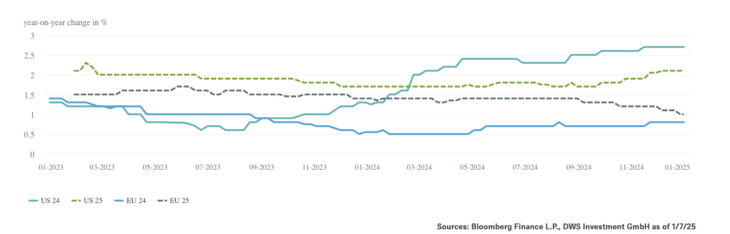 Il nostro Grafico della Settimana esamina quali tassi di crescita di Stati Uniti ed Eurozona il consenso prevedeva in diversi momenti negli ultimi due anni, sia per il 2024 che per il 2025. Forse ricorderete che per buona parte del 2023, molti prevedevano con sicurezza che gli Stati Uniti sarebbero entrati in recessione. Invece, la performance effettiva degli Stati Uniti ha sfidato i pessimisti nel 2024, con le aspettative di crescita per il 2025 che hanno ricevuto un ulteriore impulso dopo le elezioni presidenziali statunitensi di novembre.