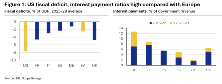 Sfide fiscali persistenti: La crescente polarizzazione politica, l’aumento del costo degli interessi e un debito pubblico con una prospettiva difficile da sostenere rappresentano sfide critiche per il futuro del rating creditizio degli Stati Uniti.