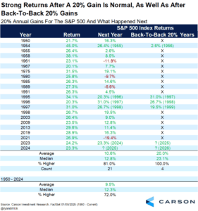 Si chiude un 2024 con performance in doppia cifra per i mercati azionari globali che dopo il +21% del 2023 chiudono il 2024 al +17% guidati dalla sovraperformance dei mercati americani (rispettivamente +24% e +23% negli ultimi due anni) dove è ormai superfluo evidenziare la polarizzazione delle performance verso il settore tech e le magnifiche sette in particolare. Siamo quindi al secondo anno consecutivo di rialzi intorno al 20% per gli azionari ma possiamo da subito evidenziare, per gli amanti delle statistiche, che non esistono evidenze storiche tali per cui dopo tali rialzi debba necessariamente seguire un anno negativo, se mai addirittura il contrario.