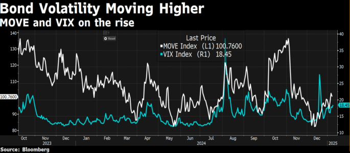 È un 2025 che si apre all’insegna dell’incremento di volatilità, sia in ambito azionario (con il VIX index) che soprattuttin ambito obbligazionario (con il Move index), entrambi a rialzo.