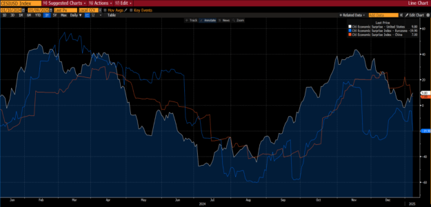 Dal punto di vista macro abbiamo uno scenario che vede in USA dati mediamente al di sopra delle attese, con gli indici di sorprese economiche rappresentati dal CITI economic surprise index che migliorano e ritornano in territorio positivo, a fronte invece di dati macro e sorprese economiche in deterioramento in Europa.