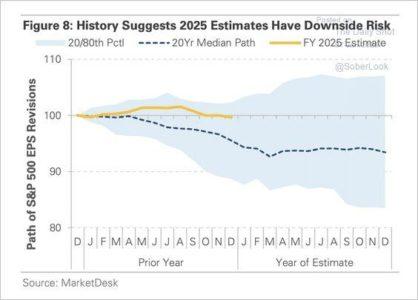Infine, siamo ancora in un ambiente molto supportivo per gli utili aziendali. Con le stime di consenso degli analisti che prevedono una crescita utili del 15% nel 2025, dopo una crescita del 10% nel 2024.