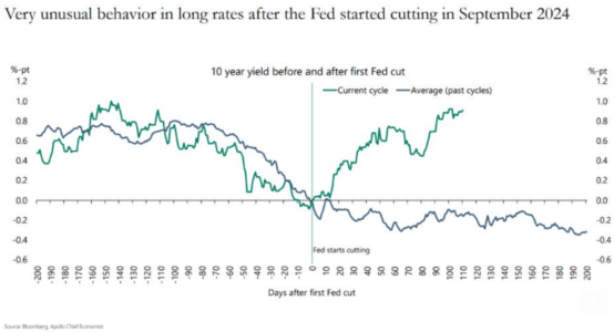 In primo luogo, le misure politiche aggressive di Trump ma soprattutto i suoi annunci, sul tema delle tariffe, sull’espulsione degli immigrati clandestini o sul taglio delle tasse, sono tutte misure potenzialmente inflazionistiche. Il tema del rialzo dei tassi è indubbiamente uno dei temi principali attualmente sui mercati. Da settembre ad oggi la FED ha tagliato i tassi dell’1.00% ma nello stesso periodo i rendimenti a 10 anni sono saliti di circa l’1,20% spinti a rialzo da un economia ancora forte che vedrà ulteriori spinte pro-crescita da parte di Trump, da timori su nuovi rischi inflattivi sempre legati alle politiche di Trump, ed infine da una risalita del premio a termine legato alle sempre maggiori incertezze all`orizzonte in un contesto di deficit statale destinato ad avvicinarsi all`8% del PIL negli USA.