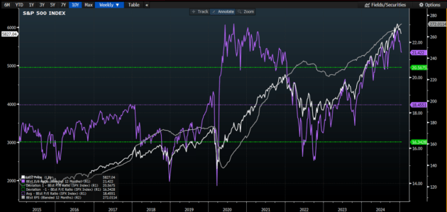 L’S&P500 attualmente viene scambiato a un rapporto P/E di 21,5 volte.