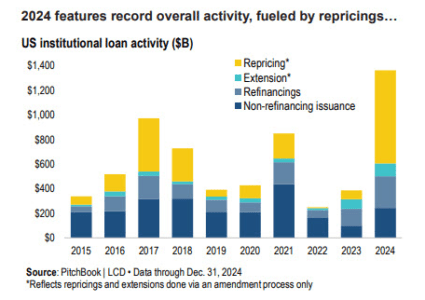 In effetti, il 2024 ha consolidato il suo posto nei libri dei record. L’attività totale di 1,4 trilioni di $ è stata superiore del 60% rispetto al conteggio del 2021 e del 41% rispetto al picco precedente nel 2017. Tuttavia, queste cifre principali sopravvalutano il caso. Escludendo i repricings che riducono semplicemente gli spread e le modifiche all’estensione delle scadenze, il volume dei prestiti di nuova emissione è stato di 501 miliardi di $ nel 2024. Sebbene sia più del doppio dei livelli del 2023 e del 2022, è rimasto indietro del 18% rispetto al 2021 ed è sceso di poco sotto i 503 miliardi di $ nel 2017.