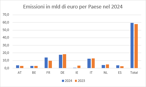 Principali Emittenti: La Germania si conferma il principale emittente, con oltre 17 miliardi di euro, seguita dalla Francia con 14 miliardi e dall’Italia con 12 miliardi. Sono state emesse nuove obbligazioni verdi da parte di questi Paesi, insieme a riaperture di obbligazioni già esistenti