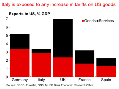 Considerando che le esportazioni italiane di beni verso gli Stati Uniti rappresentano circa il 3% del PIL, l’Italia potrebbe essere esposta ad aumenti tariffari statunitensi, sia direttamente che attraverso un impatto sulla fiducia. Il Primo Ministro Meloni potrebbe sperare che i suoi buoni rapporti personali con Trump contribuiscano a mitigare il rischio di nuovi dazi penalizzanti per l’industria italiana. Tuttavia, va considerato che molti dei principali settori di esportazione dell’Italia negli USA – come veicoli e macchinari – coincidono con quelli di altri Paesi dell’UE, riducendo le possibilità di un trattamento preferenziale nell’ambito di una eventuale più ampia strategia commerciale statunitense verso l’Europa.