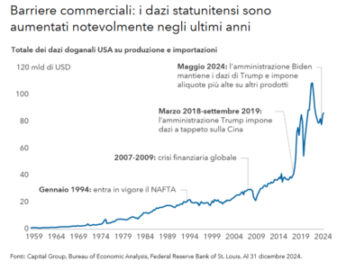 Gli annunci sui dazi e i successivi accordi per rinviarli non cambiano la nostra visione complessivamente positiva sulle prospettive dell’economia USA. L’aumento dei dazi fa parte del nostro scenario di base da un po’ di tempo, anche prima della vittoria elettorale di Donald Trump a novembre. Le barriere commerciali sono notevolmente aumentate dalla fine della crisi finanziaria globale del 2009, sia sotto Trump che Biden. Quindi la situazione era prevedibile già da diversi anni.