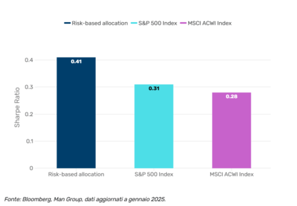 Se è vero che l’S&P 500 ha offerto forti rendimenti negli ultimi due decenni, un’allocazione basata sul rischio ha prodotto rendimenti migliori corretti per il rischio.