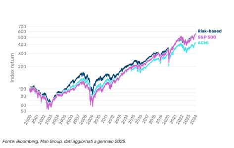 Figura 2. I rendimenti di un approccio basato sul rischio vs MSCI ACWI e S&P 500