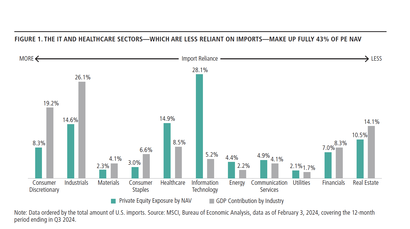 Come illustrato di seguito, i settori industriali e dei beni di consumo discrezionali, entrambi fortemente dipendenti dalle importazioni, contribuiscono complessivamente al PIL globale per il 45,3%, ma rappresentano solo il 22,9% del valore patrimoniale netto (NAV) totale del portafoglio PE; al contrario, i settori IT e sanitario, che dipendono meno dalle importazioni, rappresentano il 43% del NAV dei PE.