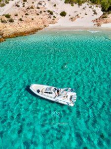 Il cuore dell’esperienza è il RIB BWA 34’, un maxi gommone lungo 10 metri e largo 4, equipaggiato con due motori Suzuki da 300 cv di ultima generazione. Scelti per il loro basso impatto ambientale e ridotti consumi, questi motori garantiscono prestazioni eccellenti, permettendo di coprire in un solo giorno più isole dell’arcipelago. Il mezzo è veloce, pratico, sicuro e perfetto per avvicinarsi alle coste più suggestive.