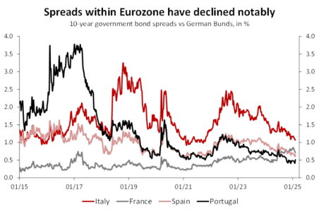 Solitamente in passato la periferia veniva identificata con i paesi sud Europei, tra i quali l’Italia, caratterizzati da tassi di crescita bassi e un alto debito pubblico, in contrapposizione ai paesi nord Europei, definiti come core. Questa divaricazione si rifletteva nella differenza tra i rendimenti delle obbligazioni governative dei singoli stati, con i paesi della periferia costretti a piazzare le proprie obbligazioni a rendimenti più elevati rispetto ai paesi core, in quello che era lo spread tra le due aree. Spread che nel tempo si è ridotto notevolmente.