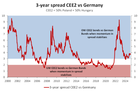 I Paesi di quest’area sono capaci di avere buoni livelli di crescita, largamente superiori a quelli dei paesi della Area Euro, inferiori stock di debito e rendimenti attraenti. Sono aree che beneficiano dei programmi europei di coesione economica ed i fondi introdotti post-covid e noti come Next Generation EU e che negli ultimi anni hanno beneficiato di investimenti dai paesi core per la decentralizzazione di alcune attività produttive. Come si vede dal grafico sotto il differenziale, ad esempio, tra i rendimenti del 3 anni in Ungheria e Polonia, rispetto al tasso 3 anni tedesco, nonostante la forte riduzione del passato sembra ancora interessante. Inoltre, le loro divise, vista la previsione di riduzione dei tassi europei, potrebbero attirare capitali e quindi le divise locali dovrebbero andare incontro a un periodo di rivalutazione. Tale mix dovrebbe produrre rendimenti interessanti.
