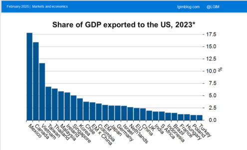 Come si evince dal grafico sottostante, in cima alla classifica di queste nazioni si trovano il Messico e il Canada, seguiti poi dal Vietnam e da Taiwan. Più in basso nella lista vi sono l’Unione Europea e la Cina, le quali vi esportano l’equivalente di appena il 2,5% del loro Pil nazionale. Tuttavia, ciò non rappresenta una consolazione, dato che, se le grandi economie dovessero reagire, la crescita globale e gli asset più rischiosi ne potrebbero comunque risentire nel breve periodo.