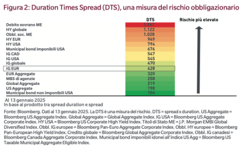 Il credito IG in euro offre un valido strumento di riduzione del rischio date le sue caratteristiche difensive. Innanzitutto, la volatilità dei rendimenti totali del credito IG in euro è nettamente inferiore a quella del credito USA, a riprova di un minor rischio per questi titoli. In particolare, negli ultimi 10 anni la volatilità del rendimento totale del credito IG in euro si è attestata al 4,8%, ben al di sotto del 7% registrato dal credito IG statunitense. Inoltre, il credito IG in euro presenta un profilo di volatilità più favorevole in termini di volatilità dei rendimenti creditizi, ossia escludendo i rendimenti derivanti dall’esposizione sottostante ai tassi. Nello specifico, la volatilità del rendimento dei titoli a 10 anni si attesta al 3,4% per l’IG in euro, contro il 4,7%, un valore nettamente superiore, dell’IG USA. Esistono molti altri modi per misurare i rischi insiti nelle varie asset class, e secondo questi parametri alternativi il credito IG in euro risulta essere un’asset class più difensiva rispetto alla sua controparte statunitense. Ad esempio, una delle misure di rischio più diffuse tra i gestori di portafogli obbligazionari è il Duration Times Spread (DTS). Come illustrato nella Figura 2, il credito IG in euro genera il DTS più basso dell’universo creditizio globale, ben al di sotto di quello dell’IG USA.