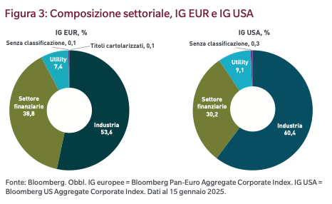 Il credito IG in euro offre vantaggi di diversificazione rispetto all’IG USA. Il primo livello di differenziazione si riscontra in termini di composizione settoriale dell’indice (Figura 3). In particolare, l’esposizione ai titoli finanziari è nettamente più elevata per i titoli IG in euro rispetto agli omologhi USA, e questa potrebbe essere una caratteristica interessante dell’indice in presenza di tassi d’interesse elevati. Per contro, la ponderazione dell’industria è significativamente inferiore rispetto agli Stati Uniti. Allo stesso modo, l’esposizione al rischio paese è notevolmente e intrinsecamente più diversificata rispetto all’indice statunitense. Ad esempio, tra i primi 3 paesi in cui avviene l’esposizione al rischio all’interno dell’indice IG in euro ci sono gli Stati Uniti (21%), la Francia (20%) e la Germania (14%), mentre nel caso dell’IG USA troviamo gli Stati Uniti (86%), il Regno Unito (4%) e il Canada (3%), un profilo decisamente diverso in termini di rischio di concentrazione geografica.