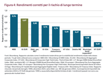 Il credito in euro ha generato rendimenti corretti per il rischio appetibili nel lungo termine. Guardando alla performance storica dell’obbligazionario globale, il credito IG in euro si rivela una delle asset class più interessanti in termini di rendimento corretto per il rischio. Di fatto, dalla fine degli anni ’90 solo gli MBS statunitensi hanno registrato un rendimento corretto per la volatilità più elevato. A nostro avviso, un rapporto rendimento/volatilità pari allo 0,88 è notevole, soprattutto se generato lungo un orizzonte temporale così esteso (Figura 4). La forte sovraperformance del credito IG in euro su base corretta per il rischio può essere in parte spiegata dal fatto che storicamente l’Eurozona ha offerto un contesto macro più favorevole alle obbligazioni rispetto agli Stati Uniti. Inoltre, la performance storica del credito statunitense, caratterizzato da una maggiore volatilità, è stata in parte influenzata dalle maggiori oscillazioni dei rendimenti.