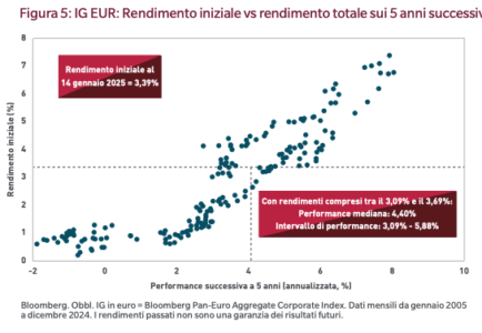 I punti d’ingresso sono importanti per i rendimenti attesi di lungo termine. Dato il livello attualmente interessante dei rendimenti offerti dai titoli IG in euro, le prospettive per i rendimenti attesi sono notevolmente migliorate. Questo perché esiste una solida relazione storica tra rendimenti iniziali come quelli odierni e la forza delle performance future. Ad esempio, con un rendimento iniziale del 3,39% per i titoli investment grade in euro, il rendimento mediano annualizzato per i cinque anni successivi – utilizzando un intervallo di 30 pb intorno al rendimento iniziale – si attesta al 4,40%, un rendimento ipotetico allettante, con rendimenti compresi nell’intervallo 3,09%-5,88% (Figura 5).