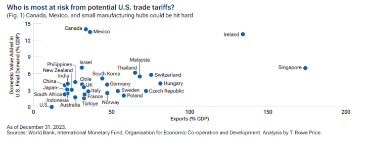 Alla luce di tutto ciò, i Paesi più a rischio includono i piccoli hub manifatturieri dell’Asia e dell’Europa centrale e orientale. Anche i paesi con un’esposizione particolarmente forte agli Stati Uniti, come il Messico e il Canada, potrebbero essere colpiti duramente.