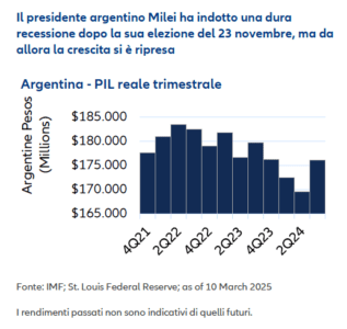 Queste sono in sostanza le motivazioni comuni che alimentano le discussioni sulla recessione. Si tratta di preoccupazioni in linea con quanto abbiamo già anticipato e del tutto ragionevoli. Eppure non tengono conto di un punto fondamentale. Perché mai il Presidente Trump dovrebbe rischiare consapevolmente una recessione? Che strategia si cela dietro al suo metodo? Sta emulando il Presidente argentino Javier Milei e il suo “approccio della motosega”? (Cfr. grafico della settimana.) Che cosa potrebbe andare bene?