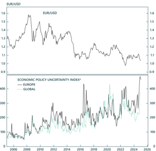 Il secondo semestre dovrebbe essere più positivo. La riduzione del tasso di utilizzo della capacità produttiva e l’attenuazione delle pressioni sui prezzi consentiranno alla Banca Centrale Europea di ridurre i tassi all’1%-1,5%. Vista la solidità dei bilanci del settore privato e considerati i tagli futuri, la riduzione al di sotto del tasso neutrale di inflazione stimolerà la domanda ma indebolirà l’euro. Poiché le esportazioni e l’industria manifatturiera europee generano una quota quasi doppia del valore aggiunto lordo e dell’occupazione rispetto a quella degli Stati Uniti, un’eventuale guerra commerciale danneggerà l’Europa più degli Stati Uniti. Solitamente, in una fase come questa, l’euro tende ad indebolirsi come successo durante il primo mandato di Trump (Fig.2). Gli afflussi di capitali negli Stati Uniti e l’apprezzamento del dollaro fanno aumentare il costo del capitale, inasprendo le condizioni finanziarie globali.