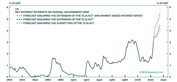 In risposta a questo irripidimento ribassista, da dicembre la Fed ha assunto toni restrittivi, scontrandosi con Trump. I premi a termine sono aumentati e il mercato evidenzia che l’economia è in grado di tollerare tassi a lungo termine più elevati, probabilmente anche in virtù del cosiddetto “eccezionalismo statunitense”. Trump vuole ridurre le imposte, e ciò indurrà gli investitori ad esigere un premio per il rischio d’inflazione. Tuttavia, il Tesoro ha emesso 4.500 miliardi di dollari di debito nel 2024, mentre la Fed ha ridimensionato il suo bilancio, aumentando l’offerta che gli investitori dovranno assorbire. Il deficit pubblico ha ora raggiunto quota 7%, ed il costo di questo debito è passato dall’1,3% del PIL del 2016 a oltre il 3% (Fig.1). Se Trump dovesse decidere di prorogare i tagli d’imposta risalenti al suo primo mandato e prossimi alla scadenza, il pagamento degli interessi raggiungerà il 6% del PIL entro 10 anni, assorbendo un terzo delle entrate statali. Prima del suo insediamento, Trump ha spinto per rimuovere il tetto del debito nel 2025 per consentire ulteriori riduzioni d’imposta, ma 38 membri repubblicani del Congresso si sono espressi a sfavore. L’aumento del deficit alimenterebbe l’inflazione, e un contesto caratterizzato da inflazione e/o da una crisi fiscale non aiuterebbe i Repubblicani ad essere rieletti nel 2026. Quando Trump è stato eletto nel 2016, i rendimenti obbligazionari erano all’1,5%, ora sono al 4,5%.