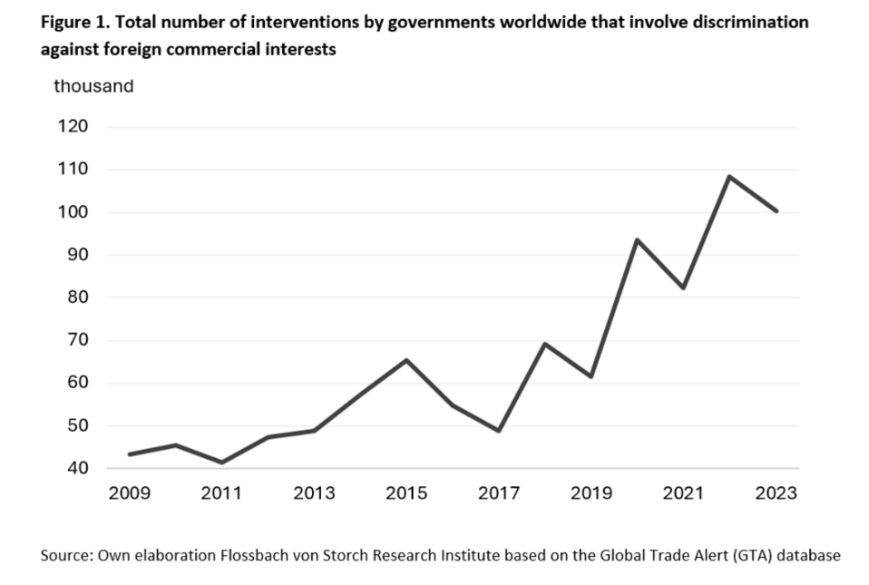 È importante notare che il database GTA probabilmente sottostima gli interventi governativi, soprattutto nei casi in cui il protezionismo è incorporato in regolamenti, sussidi o politiche fiscali che non rientrano tra le politiche esplicitamente legate al commercio. Ne sono un esempio le normative ambientali – adottate su larga scala nell’UE – o gli stimoli fiscali con requisiti di contenuto nazionale – come l’Inflation Reduction Act negli Stati Uniti. Queste misure sono molto più difficili da classificare come interventi commerciali e, di conseguenza, rischiano di non essere incluse nel database GTA.