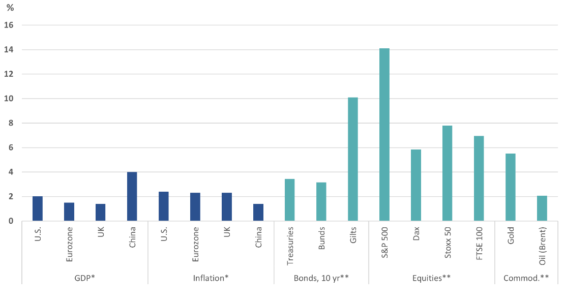*Le previsioni su Prodotto Interno Lordo (PIL) e inflazione si riferiscono all’anno solare 2025. **Le previsioni di rendimento totale sono valide fino alla fine di marzo 2026. Gilts = titoli di Stato britannici a 10 anni; Bund = titoli di Stato tedeschi a 10 anni; S&P 500 = indice S&P 500; Dax = indice DAX 40; Stoxx 50 = indice Euro Stoxx 50; FTSE 100 = indice FTSE 100; Oil = Brent Crude Oil; Gold = indice valutario XAU