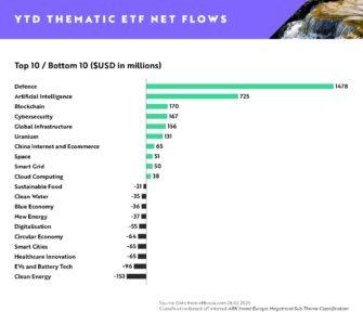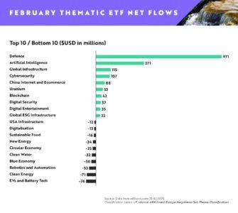 Febbraio ha visto flussi netti complessivi sugli ETF tematici pari a 1,54 miliardi di dollari, battendo anche il dato di gennaio. Gli investitori hanno guardato in particolare ad alcuni megatrend su cui c’è forte convinzione, come difesa, IA, infrastrutture e cybersicurezza.
