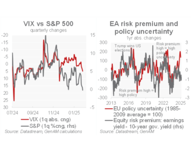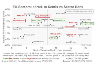 Le condizioni finanziarie sono migliorate e si osserva una rotazione fuori dalla tecnologia statunitense a causa di una crescita degli utili relativa più bassa. Indicatori positivi includono un miglioramento nei PMI e nel Sentix per l’Eurozona, un alto gap di free cash flow rispetto al CAPEX, una buona tendenza in M2 e un aumento dell’attività di fusioni e acquisizioni (M&A). L’outlook sul credito rimane positivo e i modelli quantitativi risultano favorevoli alle azioni rispetto ai bond. Ci sono aspettative crescenti per un aumento degli investimenti in difesa in Europa, in particolare in Germania.