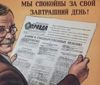 Il sistema previdenziale russo ha subito numerose trasformazioni prima e durante la presidenza di Vladimir Putin. Ecco un confronto tra il sistema previdenziale prima dell’era Putin e quello attuale (nell’immagine: Lo slogan “Siamo sereni sul nostro domani”. Il titolo della Pravda “Legge sulle pensioni statali”).