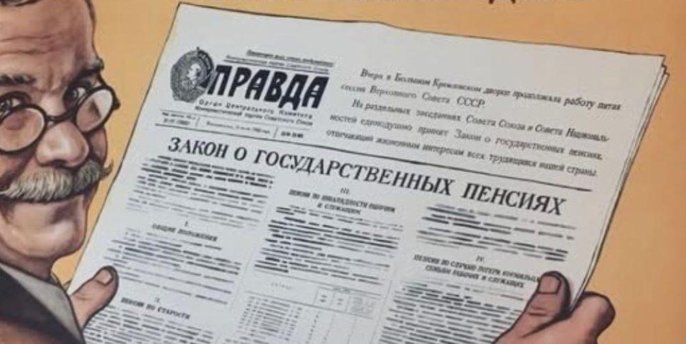 Il sistema previdenziale russo ha subito numerose trasformazioni prima e durante la presidenza di Vladimir Putin. Ecco un confronto tra il sistema previdenziale prima dell’era Putin e quello attuale (nell’immagine: Lo slogan “Siamo sereni sul nostro domani”. Il titolo della Pravda “Legge sulle pensioni statali”).