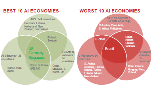 Tutti gli indicatori considerati identificano il Brasile come molto poco preparato per l’IA. Non sono così chiari i segnali per altri Paesi, ma la nostra conclusione è che Kuwait, Vietnam, Ucraina, Georgia, Ungheria, Polonia, Russia, Messico, Sudafrica e Turchia non si trovano in una posizione di forza.