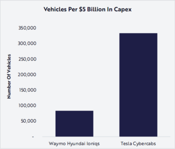 Tesla, invece, è integrata verticalmente: produce da sé le sue auto. E invece dei LiDAR, la sua piattaforma è ora alimentata da telecamere e apprendimento automatico. Il risultato è un costo inferiore per portare sulle strade ciascuno dei robotaxi di Tesla. Come mostra il grafico sottostante, rispetto alle Hyundai Ioniq di Waymo l’azienda sarà in grado di lanciare molti più Cybercab per ogni 5 miliardi di dollari di investimento.