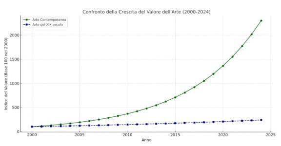 Il grafico mostra chiaramente la differenza nella crescita di valore tra l’arte contemporanea e, ad esempio, quella del XIX secolo dal 2000 al 2024: la prima ha avuto un’impennata del +2200%, mentre la seconda è cresciuta più moderatamente, con un incremento stimato del +140%.