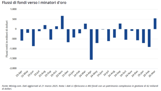 La domanda d’investimento segnala cambiamenti nel sentiment del mercato – Le performance contrastanti evidenziano un cambiamento nel sentimento degli investitori verso l’oro e le azioni correlate. La crescente domanda d’investimento nell’oro fisico si è tradotta in un altro mese di forti afflussi negli ETF sostenuti dall’oro fisico, con un aumento delle partecipazioni del 2,82% nel corso del mese4. Ancora più importante, secondo i dati di LSEG Lipper, questa impennata di interesse degli investitori per il settore dell’oro ha portato ai maggiori afflussi netti mensili in più di un anno per i fondi che investono nei minatori d’oro, invertendo una tendenza di deflussi netti persistenti negli ultimi due anni. I fondi che investono nell’oro fisico e nei derivati dell’oro hanno attirato 17,8 miliardi di dollari netti nel 2024, il massimo degli ultimi cinque anni, mentre i fondi che investono nei minatori d’oro hanno perso 4,6 miliardi di dollari netti, il massimo in un decennio.