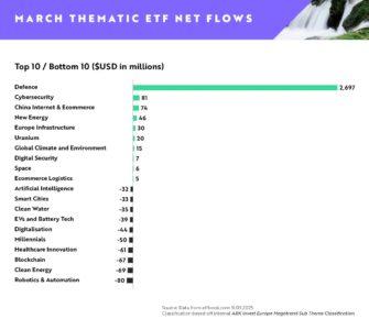 Da inizio anno fino al 31 marzo, i flussi netti sui tematici si sono attestati a +4,77 miliardi di dollari, con la Difesa e l’Intelligenza artificiale in testa (rispettivamente +4,18 miliardi di dollari e + 678 milioni di dollari ), seguite da temi come Cybersecurity e Uranio, quest’ultimo favorito dalla domanda di energia nucleare in aumento in molti Paesi.