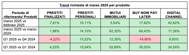 Analizzando le motivazioni alla base delle richieste di prestiti finalizzati, si osserva un trend positivo per la richiesta di autoveicoli usati rispetto a marzo 2024 (+7,9%). Nel confronto con febbraio spiccano in particolare le richieste di finanziamento per motocicli e biciclette (+40,7%) e per gli articoli di campeggio e giardinaggio (+29,8%) in previsione della bella stagione.