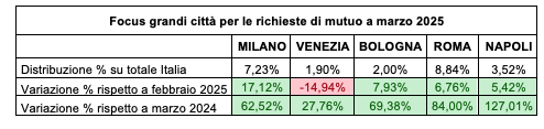 A livello geografico, si notano dinamiche interessanti: il Centro e il Sud mostrano una crescita più sostenuta rispetto al Nord, con un incremento di richieste rispettivamente del +68,5% e del +72,8%. Un trend che si riflette anche nell’analisi delle grandi città: spicca infatti l’andamento di Napoli, dove le richieste di mutuo sono aumentate del 127% rispetto a marzo 2024, e di Roma, che registra un incremento dell’84% rispetto allo stesso periodo. Un dato interessante riguarda i richiedenti nati all’estero che a marzo rappresentano un quarto del totale dei richiedenti (25,3%).