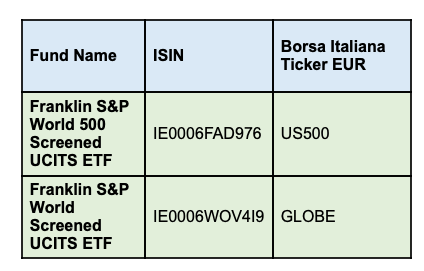 Caratteristiche principali del Franklin S&P 500 Screened UCITS ETF e del Franklin S&P World Screened UCITS ETF