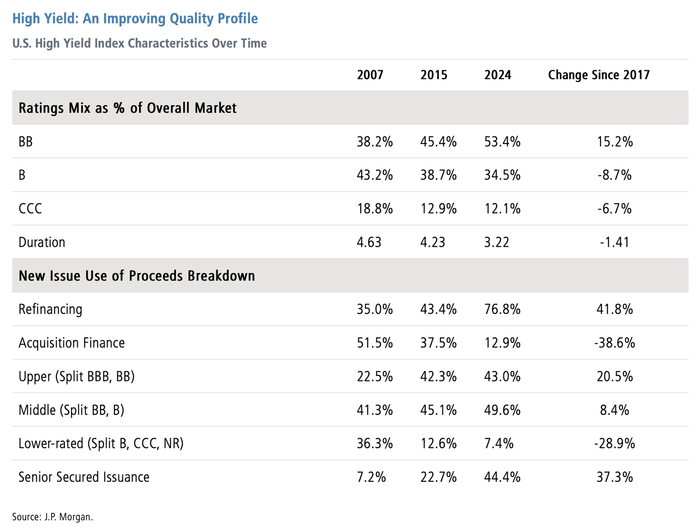 Qualità in miglioramento – Negli ultimi 10-15 anni l’high yield è maturato, in un mercato con una maggiore proporzione di obbligazioni con rating BB (+1.500pb dal 2007), un aumento delle emissioni di debito garantito (+3.700pb dal 2007), una minore duration (circa 1,4 anni in meno dal 2007) e un uso molto più conservativo dei proventi. Il finanziamento delle acquisizioni è diminuito di circa 3.800pb dal 2007 e i titoli con rating più basso rappresentano ora meno del 10% del totale delle nuove emissioni, rispetto al 36% registrato nel 2007 durante il periodo precedente la crisi finanziaria globale. Ognuno di questi fattori, isolatamente, rappresenta una riduzione del rischio di perdita di credito e di insolvenza per il mercato, e collettivamente, solo poche settimane fa, stavano portando gli spread high yield a livelli prossimi a quelli storici.