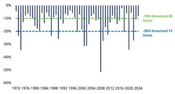 Prendendo in considerazione i mercati azionari mondiali (rappresentati dall’indice MSCI World), cali del 10% si sono verificati in 30 dei 53 anni solari precedenti al 2025. Nell’ultimo decennio, questi includono il 2015, il 2016, il 2018, il 2020, il 2022 e il 2023.