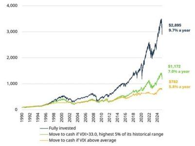 L’indice Vix, l’“indicatore della paura” del mercato azionario, ha registrato un’impennata la scorsa settimana. Il Vix misura la quantità di volatilità che i trader si aspettano per l’indice statunitense S&P 500 nei prossimi 30 giorni. Il 4 aprile ha chiuso a 45, ben al di sopra della media di lungo periodo di 19.Tuttavia, storicamente, per gli investitori sarebbe stata una cattiva idea vendere durante i periodi di maggiore paura.