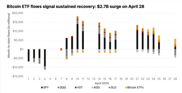 Perfino GLD, il più grande ETF sull’oro, considerato la quintessenza del bene rifugio, ha sottoperformato, soprattutto ad aprile, quando, dopo il “Liberation Day”, ha registrato cinque giorni consecutivi di outflow, arrivando a segnare perdite per 1,2 miliardi il 22 aprile. Nello stesso giorno i BTC ETF hanno accumulato 400 milioni.
