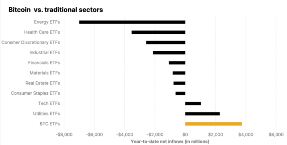 Gli ETF sul Bitcoin non hanno solo registrato performance migliori di SPY, QQQ, GLD e AGG, ma hanno anche superato in termini di prestazioni i maggiori ETF settoriali. Con 3,5 miliardi di afflussi YTD, hanno ampiamente superato gli ETF sulle utility (2,3 miliardi di dollari) e gli ETF tecnologici (1 miliardo di dollari).